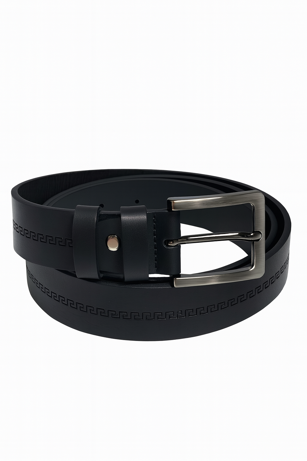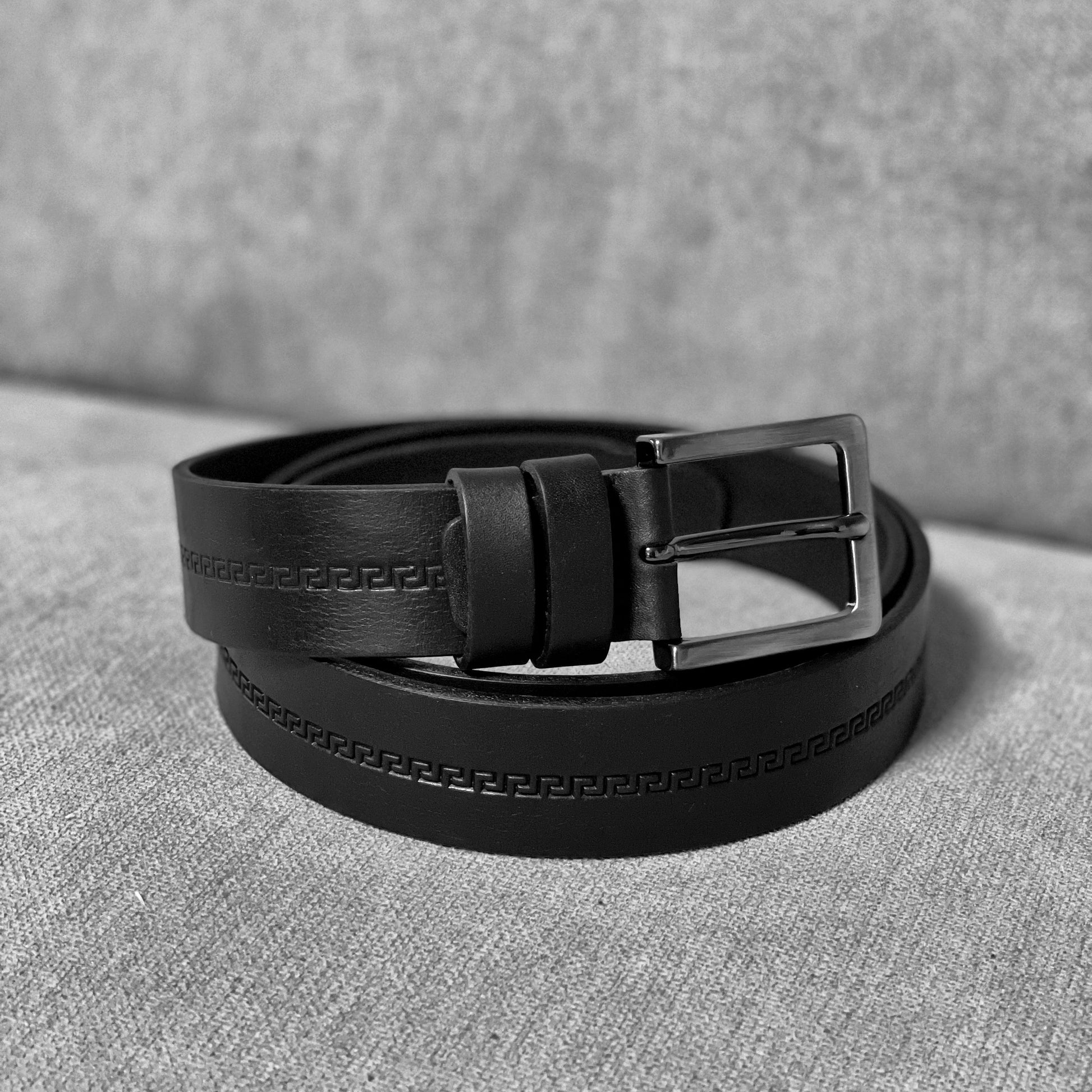 Elegantiškas ir ilgaamžis juodas natūralios odos diržas, išsiskiriantis subtiliu geometriniu raštu, einančiu per visą diržo ilgį. Aukštos kokybės oda suteikia tvirtumo ir ilgaamžiškumo, o matinė tekstūra atrodo moderniai ir solidžiai.